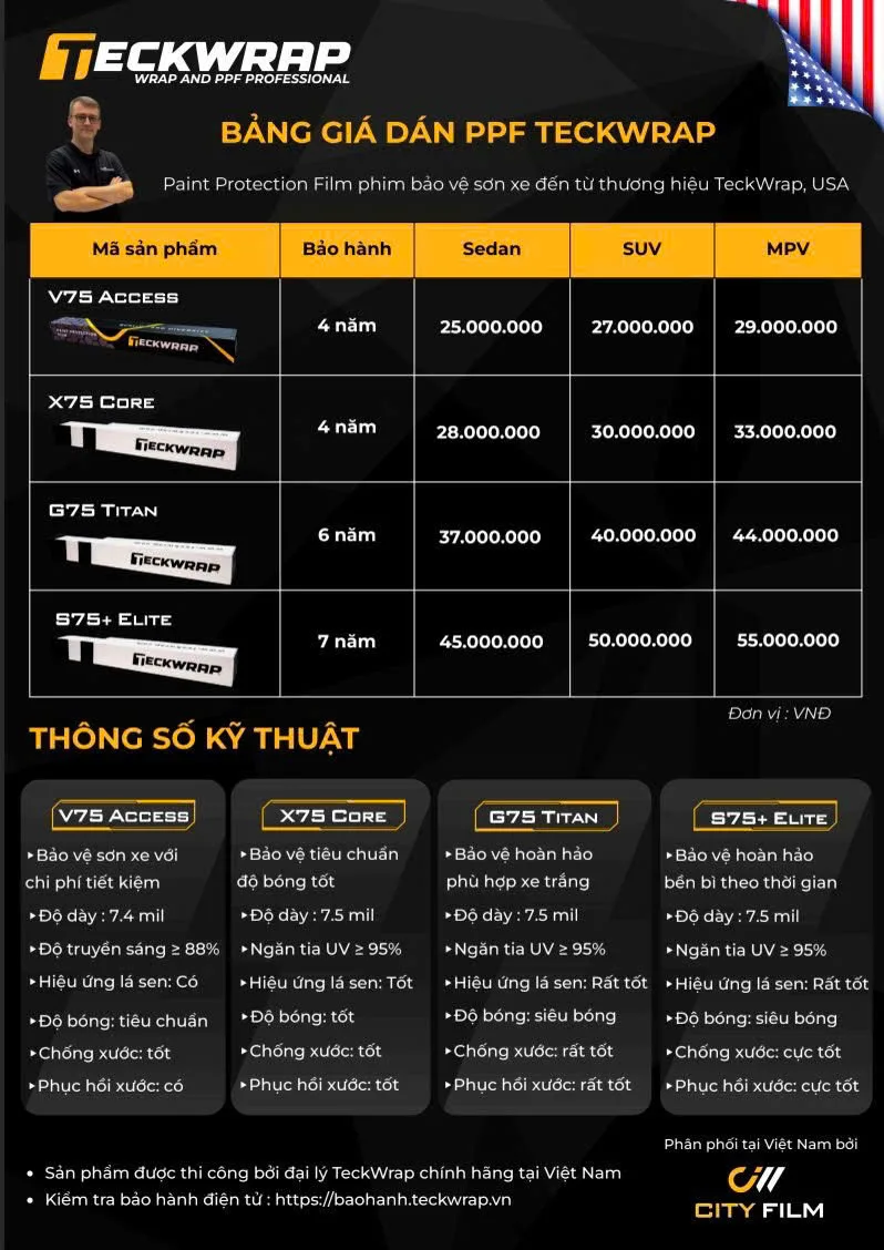 Teckwrap được biết đến với khả năng chống trầy xước tuyệt vời và độ bền cao, giúp bảo vệ xe khỏi các tác động môi trường. Teckwrap cung cấp nhiều màu sắc và kiểu dáng, cho phép khách hàng thoải mái lựa chọn theo phong cách và sở thích cá nhân. Đây là lựa chọn lý tưởng cho những chiếc xe thể thao hay xe cần sự bảo vệ cao.