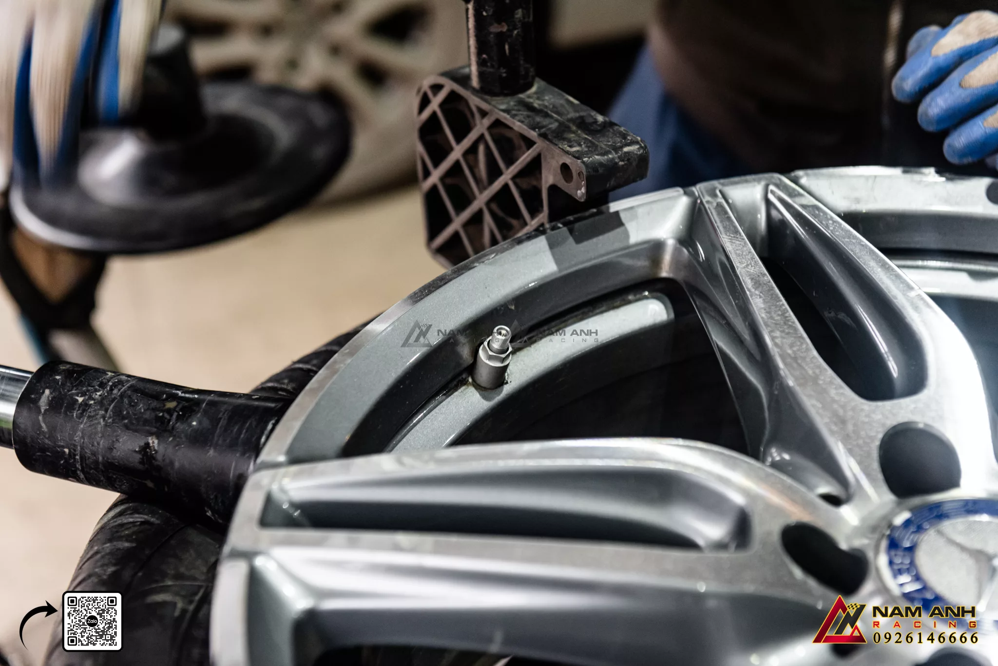 - Bước 3: Tiến hành lắp đặt cảm biến vào van lốp của từng bánh xe, đảm bảo cân bằng bánh xe sau khi lắp.
